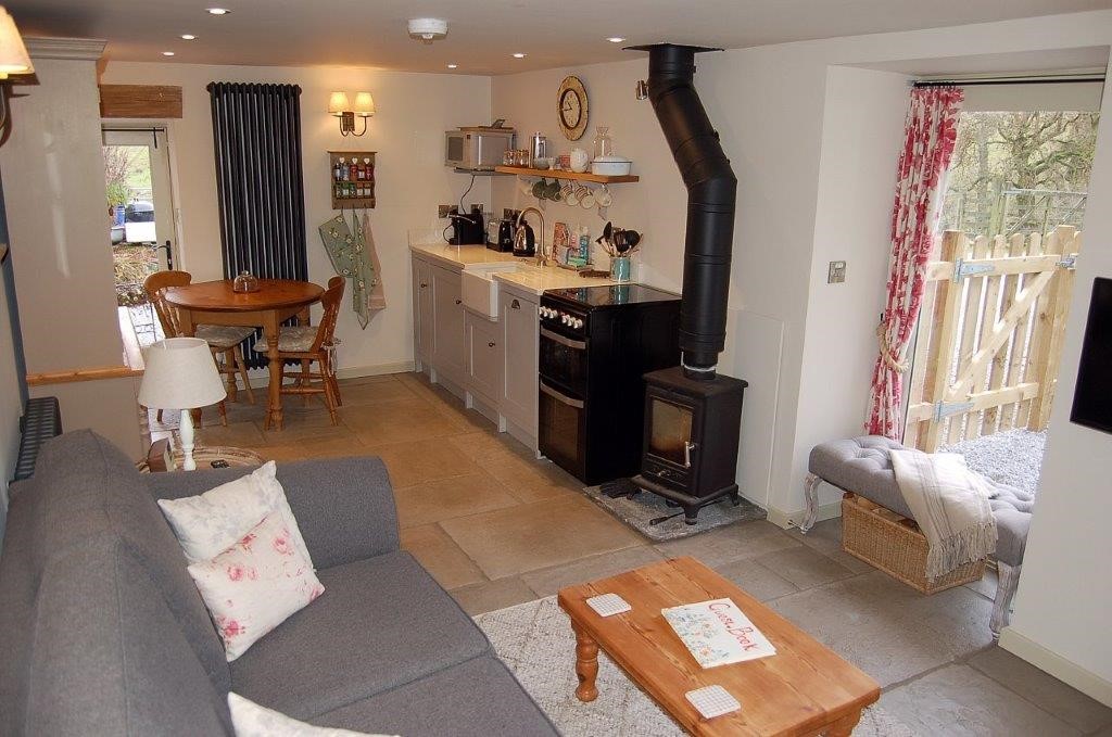 Lounge - An attractive area with a comfortable two seater sofa perfect for curling up in after a hard day exploring, a window seat in front of a full length window with views of the surrounding fields and hills, a cosy wood burning stove, Smart TV with Amazon Prime, box sets, on demand TV, apps and games, a small book swap area and some games to keep you occupied if you are having an evening in. Stairs to the first floor with a full length window offering further views of the hills to the rear of the barn.
