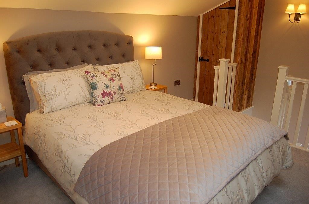 Tasteful bedroom - luxurious king-size bed and quality bedding, a fitted wardrobe and shelves to store all your clothes, also housing an iron and ironing board, a full length mirror and dressing table. Restricted head height at the edges of the room but plenty of space to stand upright in the bulk of the room. Two skylight windows for star gazing should you wish, fitted with blackout blinds for a good night’s sleep.
