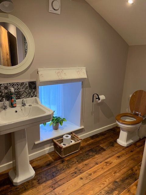 Bathroom - beautiful spacious room fitted with a generously sized walk-in shower, WC, basin and mirror, shaver socket, bespoke cupboard made from reclaimed wood, old characterful floorboards, and a low window offering views across the hills to the side of the barn.